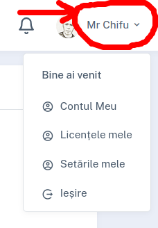 Informații despre licența curentă se pot obține din Setări (Click pe numele de utilizator in colțul dreapta sus):