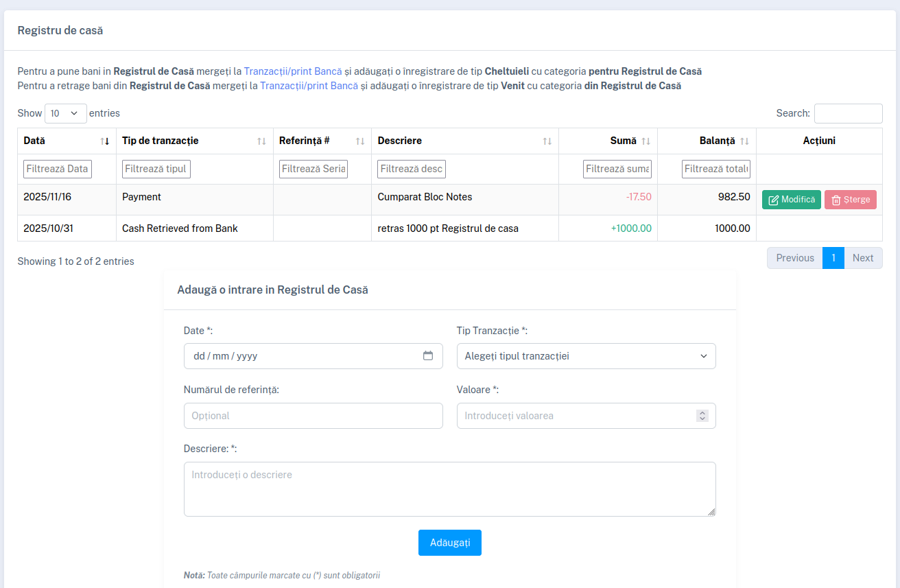 Permite managementul unui Registru de casă